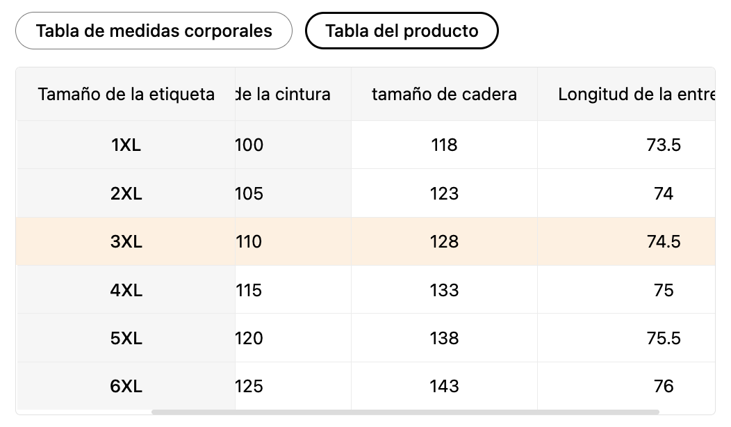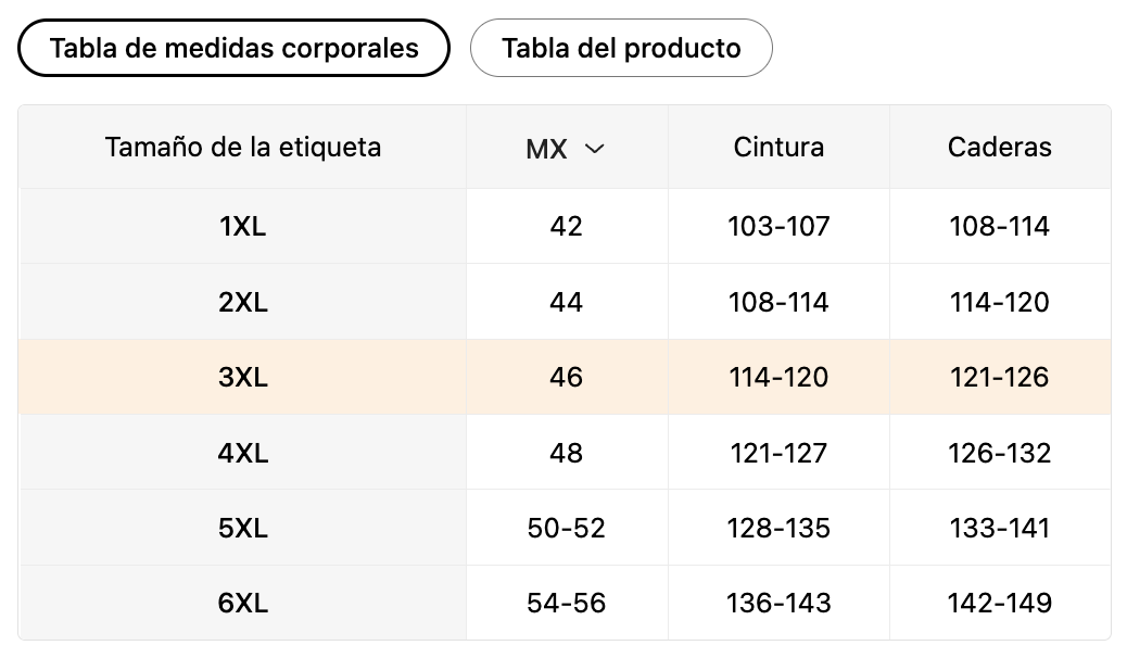 | Tamaño de la etiqueta | MX | Cintura | Caderas |