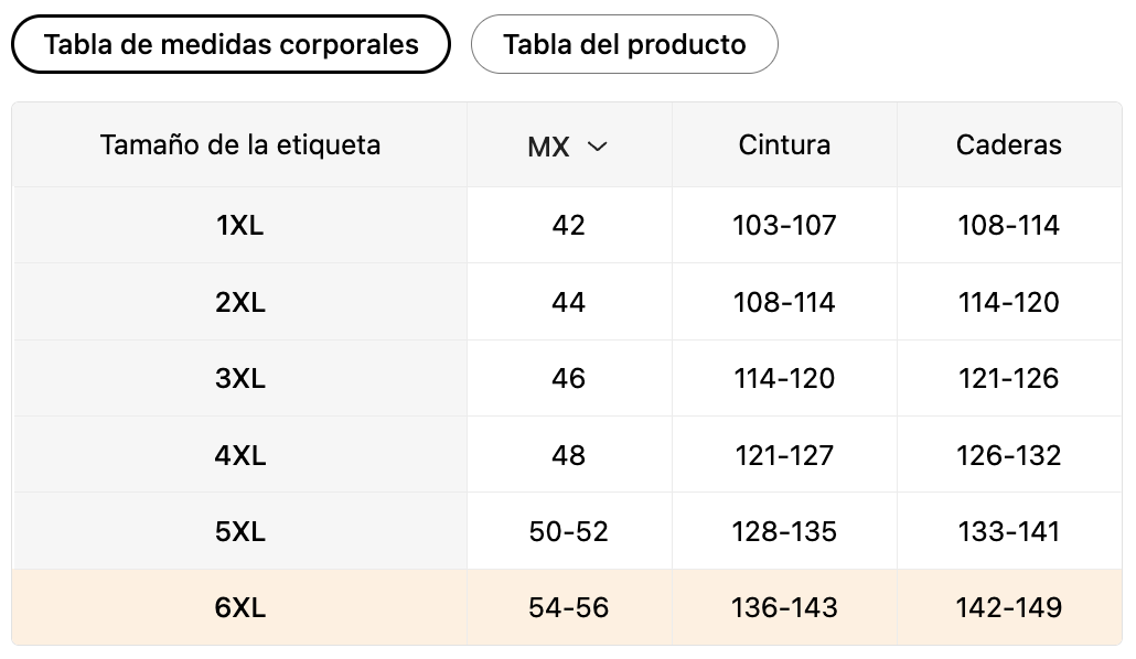| Tamaño de la etiqueta | MX | Cintura | Caderas |