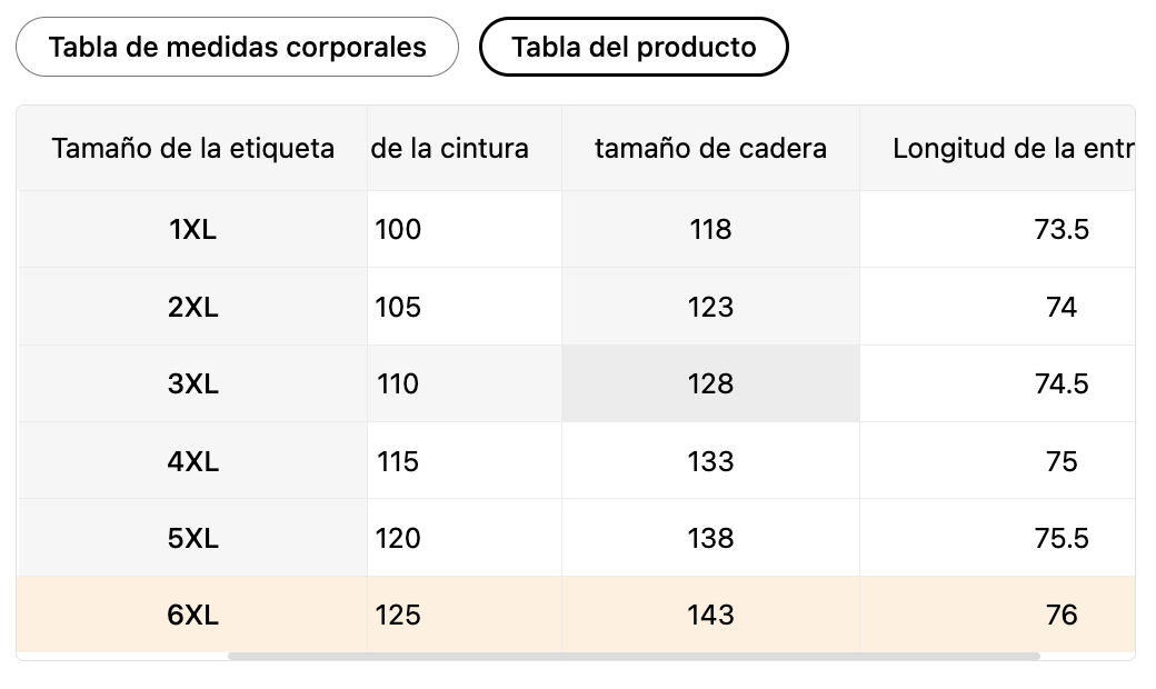 | Tamaño de la etiqueta | Medida de la cintura | Tamaño de cadera | Longitud de la entrepierna |