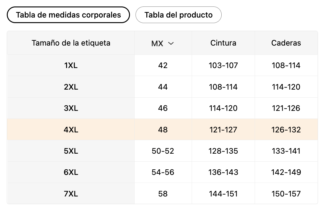 | Tamaño de la etiqueta | MX | Cintura (cm) | Caderas (cm) |