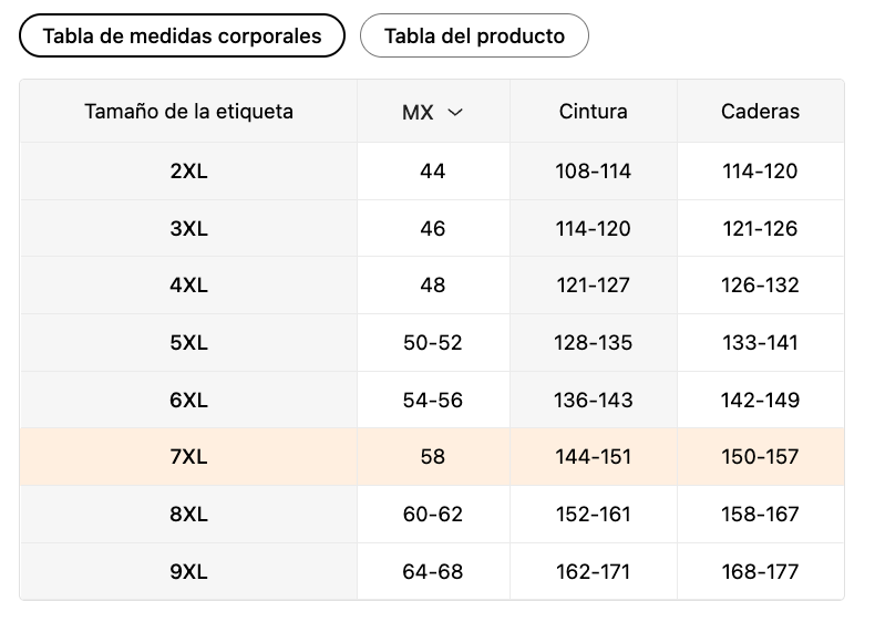 | Tamaño de la etiqueta | Talla MX | Cintura (cm) | Caderas (cm) |