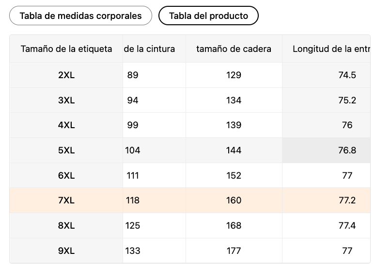 Tabla de medidas del producto