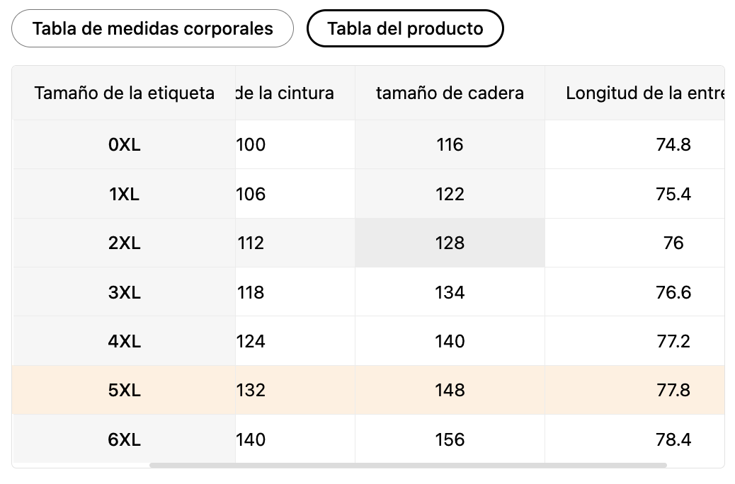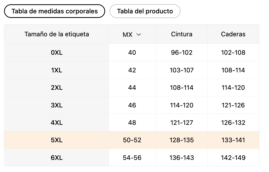 | Tamaño de la etiqueta | MX | Cintura | Caderas |