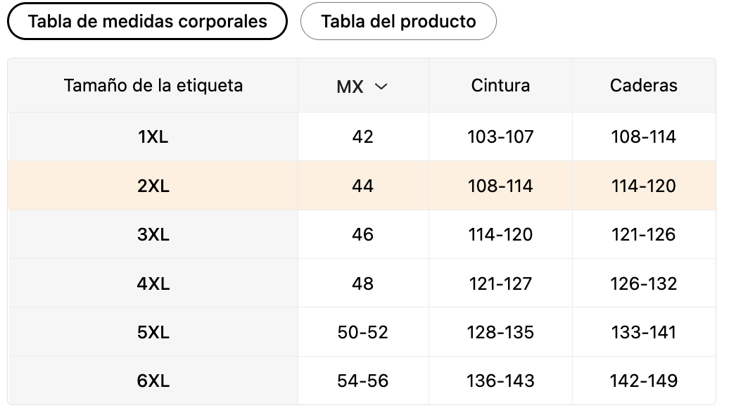 | Tamaño de la etiqueta | MX | Cintura | Caderas |