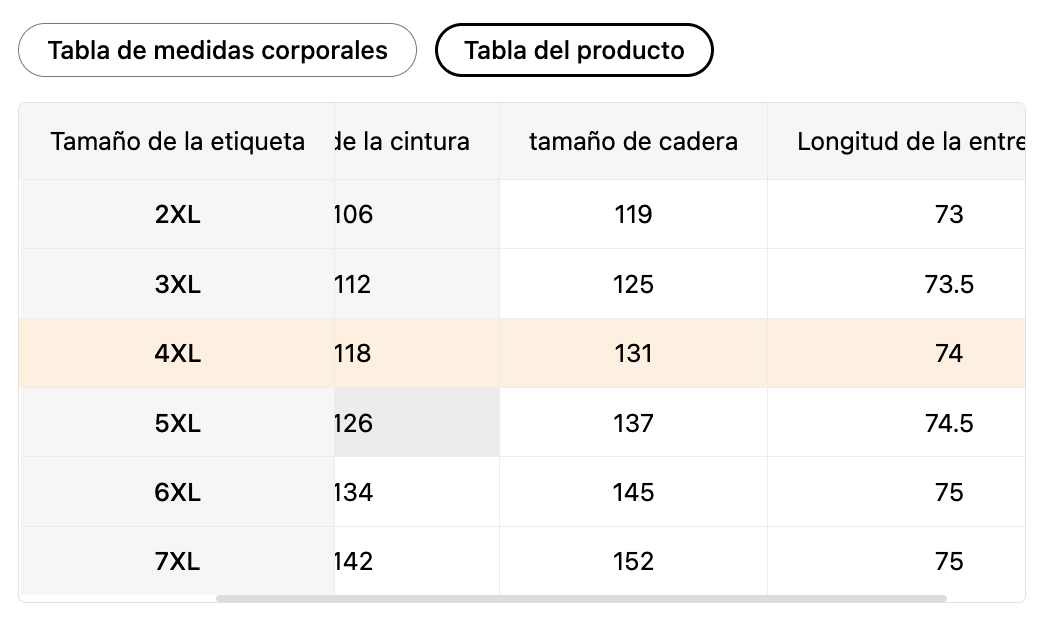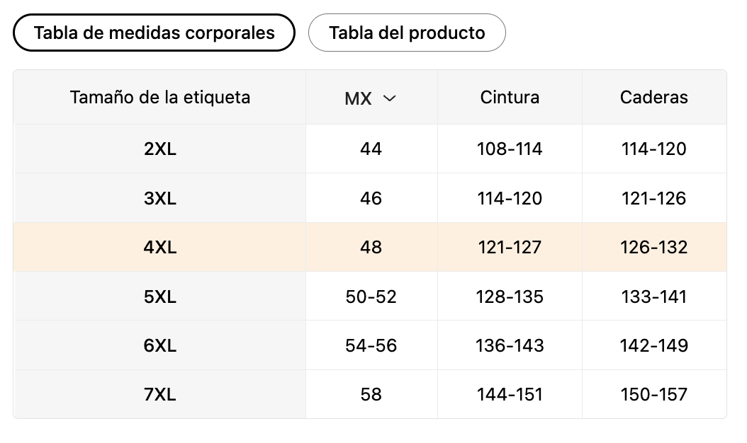 | Tamaño de la etiqueta | MX | Cintura | Caderas |