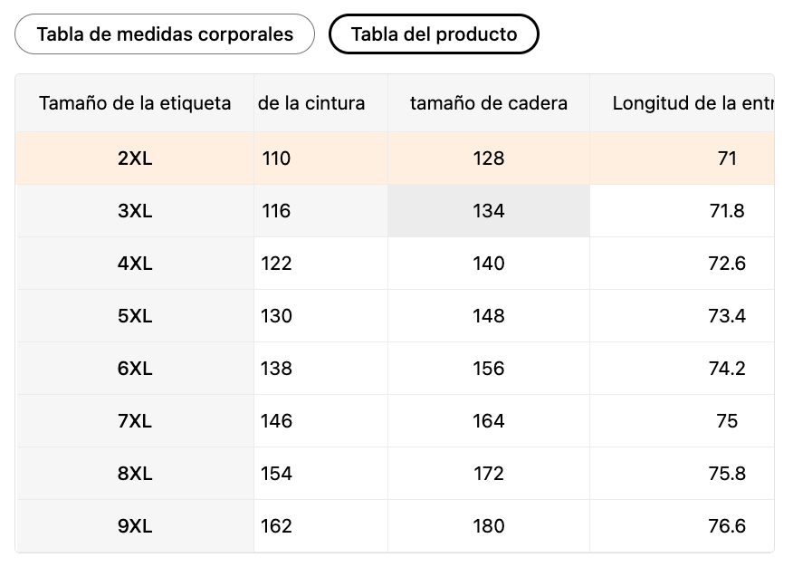 | Tamaño de la etiqueta | MX | Cintura | Caderas |