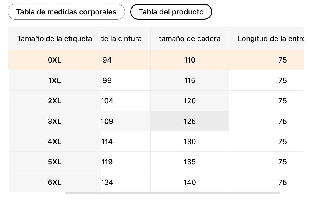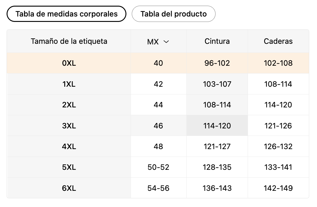 | Tamaño de la etiqueta | MX | Cintura | Caderas |