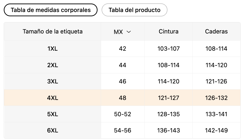 | Tamaño de la etiqueta | MX | Cintura | Caderas |