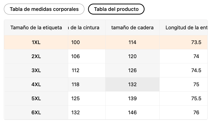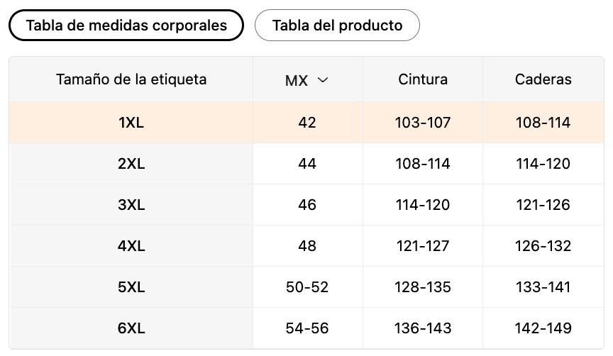 | Tamaño de la etiqueta | MX | Cintura (cm) | Caderas (cm) |