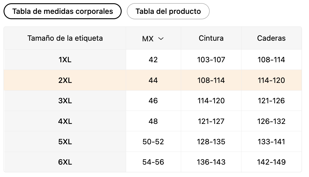 | Tamaño de la etiqueta | MX | Cintura (cm) | Caderas (cm) |