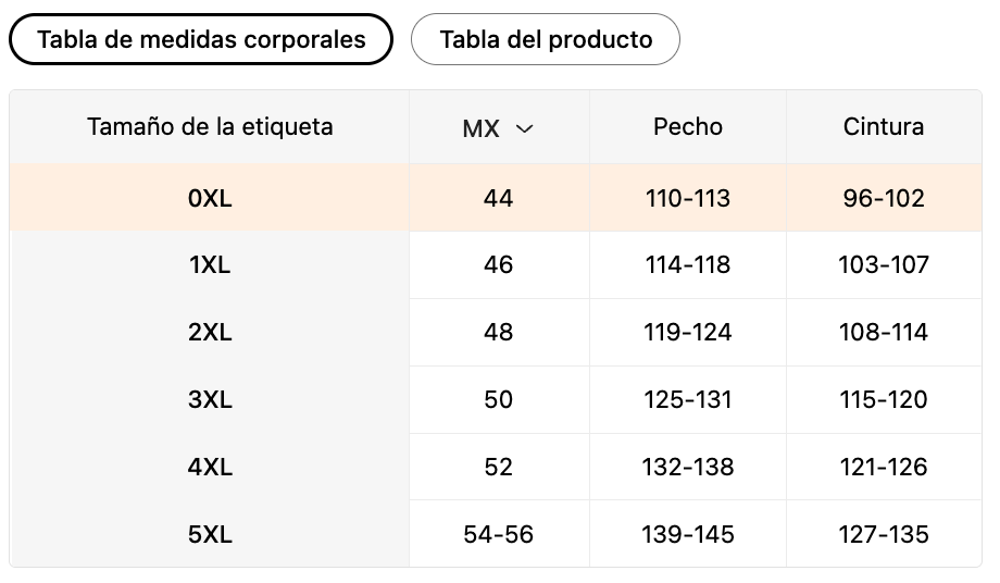 | Tamaño de la etiqueta | MX | Pecho | Cintura |
