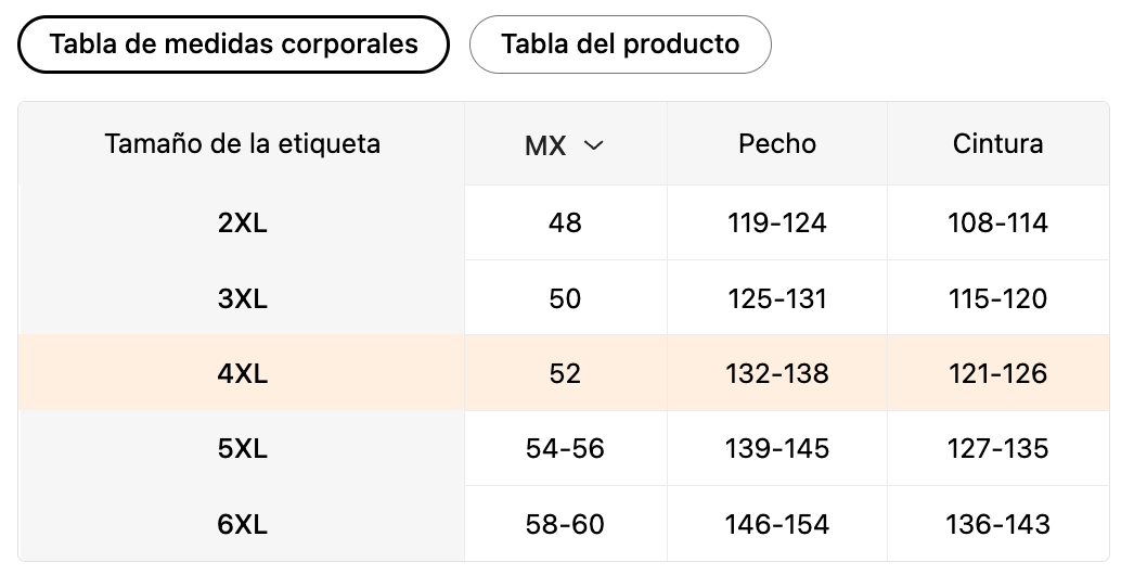 | Tamaño de la etiqueta | MX | Pecho | Cintura |